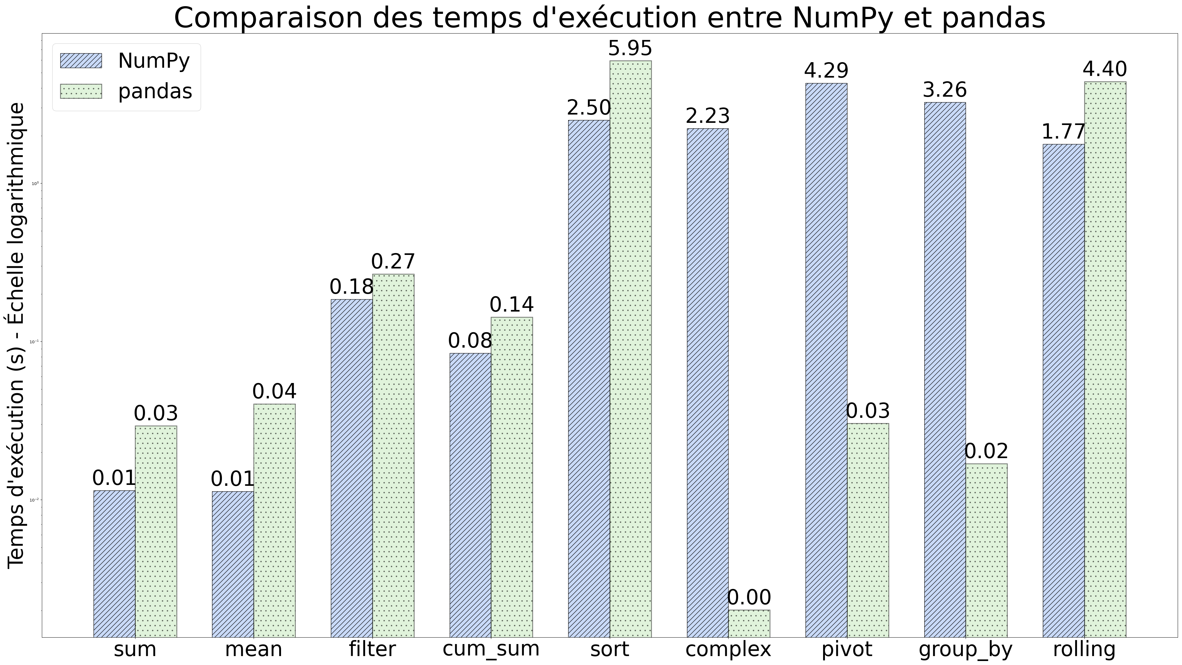 Dans la plupart des cas, NumPy peut être légèrement plus rapide que pandas, car NumPy est plus bas niveau et a moins de surcharge. Cependant, pandas offre des structures de données et des fonctionnalités plus avancées, ce qui peut faciliter le travail avec des ensembles de données complexes. Les performances relatives de NumPy et pandas dépendent également des opérations spécifiques effectuées sur les données, de sorte que les différences de performances peuvent varier en fonction des tâches spécifiques. Certaines fonctions n’existent qu’avec pandas, et qui n’ont pas d’équivalents NumPy sont : read_csv, read_excel, groupby, pivot_table, merge, concat, melt, crosstab, cut, qcut, get_dummies et applymap.